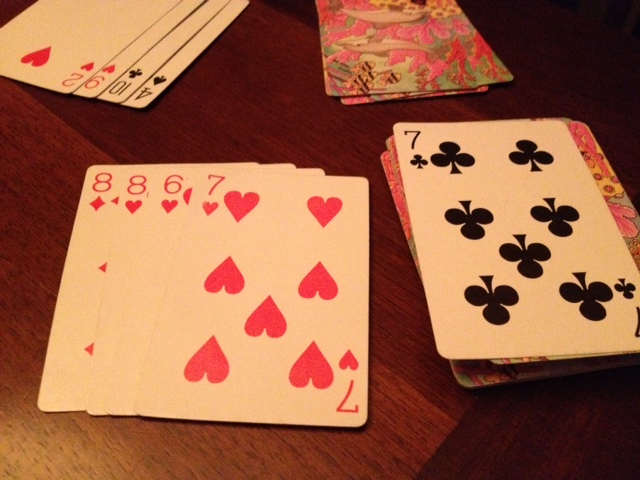 Upon learning to play the game as an adult, it quickly became painfully clear just how bad I am at math. The game requires some very basic skills using addition, most of which involve coming up with various ways to get to the number 15. If you have cards that add up to 15, you see, you get to move ahead two spaces on the cribbage board. Since you can use five cards, there is the potential for various combinations.
