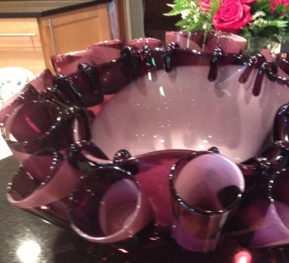 Then, I saw it: a wavy, purple punch bowl shot through with milky white glass so that it looked like a sea anemone. The sixth season of “Mad Men” had just started and I was in love with Don Draper and the 1960s all over again. This bowl belonged in that show. I bent over and saw that the glasses had extended handles so they could hang onto the side of the bowl with ease. I imagined having all of my friends over at Christmas, William wonderfully healthy, and serving a killer punch. Maybe I’d make it a 1960s theme and everyone could stand in the kitchen holding these little glasses, the women’s eyeliner extending catlike over their lids, the men in plaid pants.