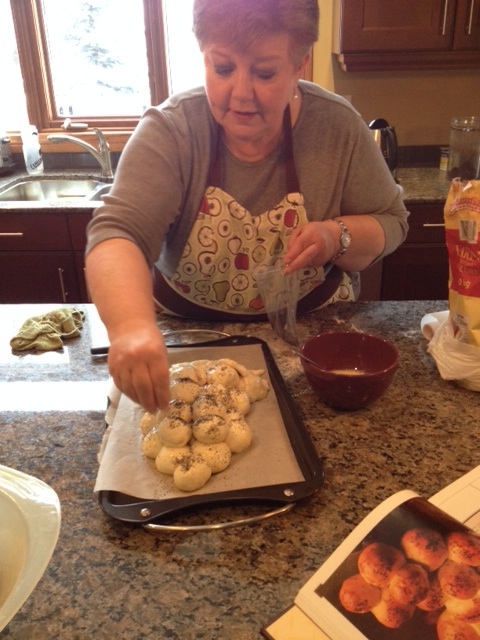 Anyway, two days ago while I was spending a few days in Winnipeg, Carol arrived with her banker’s box again. This time our project was a table centerpiece that looked like a bunch of grapes, with each grape actually a little bun covered in poppy seeds. Once again, Carol shared her wealth of knowledge, and I ate it up nearly as happily as I ate the grape-buns we eventually baked. It was while I was watching her expertly disengage the dough from her mixer whisk that I realized the true happiness that comes from baking bread.