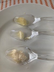 - Duke’s: Second-place for silky texture (this mayo also only uses egg yolks). The mixture was the color of heavy whipping cream. Cider vinegar is used here, which provides an extremely pleasing tang. Paprika adds additional intrigue. Spreadability is perfect, smearing smoothly but thick enough to coat the toast with a pleasing layer. Places second of the three mayos for calorie count at 100 cals per 1 Tbsp. Salt content is the lowest of the three at 70 mg per 1 Tbsp. Duke’s is only mayo of the three that does not contain sugar. All three participants consumed all of the Duke’s on their disposable spoons. Joy factor: 9/10